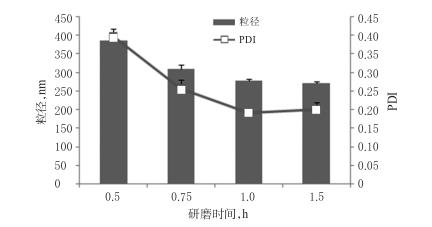 2.1.3研磨時(shí)間的篩選稱取BRE原料藥7.5g,置于含有吐溫80(1.125g)的水溶液(22.5mL)中,攪拌混懸,加入氧化鋯珠(粒徑為0.6mm)450g,分別研磨0.5、0.75、1.0、1.5h,制備3批BRE納米晶混懸液。以BRE納米晶混懸液的粒徑、PDI為指標(biāo),篩選研磨時(shí)間。結(jié)果,隨著研磨時(shí)間的延長(zhǎng),BRE納米晶混懸液的粒徑、PDI逐漸減小;研磨0.5、0.75、1.0h時(shí),BRE納米晶混懸液的粒徑、PDI減小的幅度較大;研磨1.5h時(shí),BRE納米晶混懸液粒徑雖然較研磨1.0h時(shí)的粒徑減小,但減小幅度不大。綜合考慮能耗和時(shí)間,確定研磨時(shí)間為1h。研磨時(shí)間的篩選結(jié)果見圖3。
